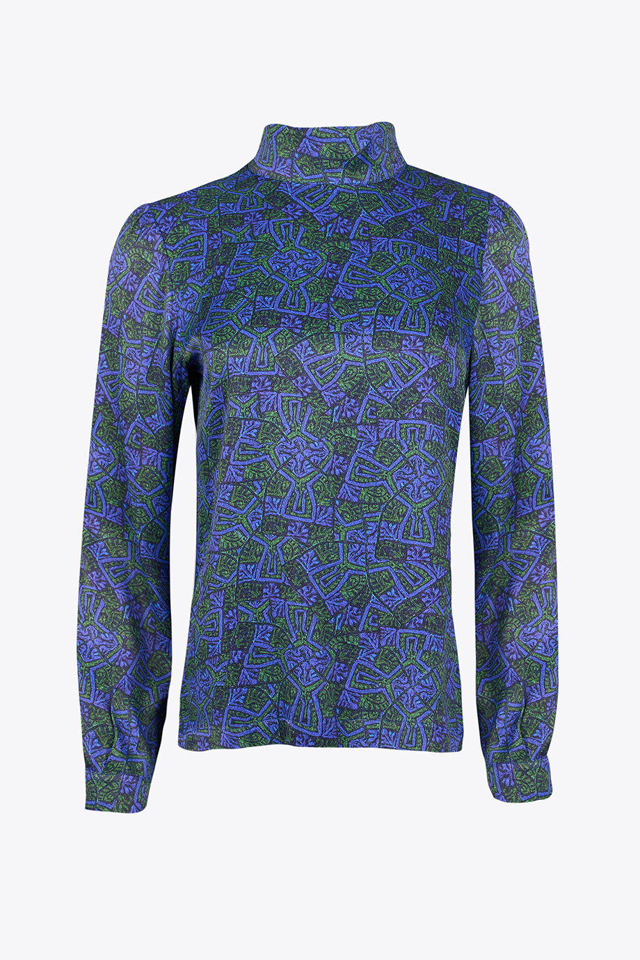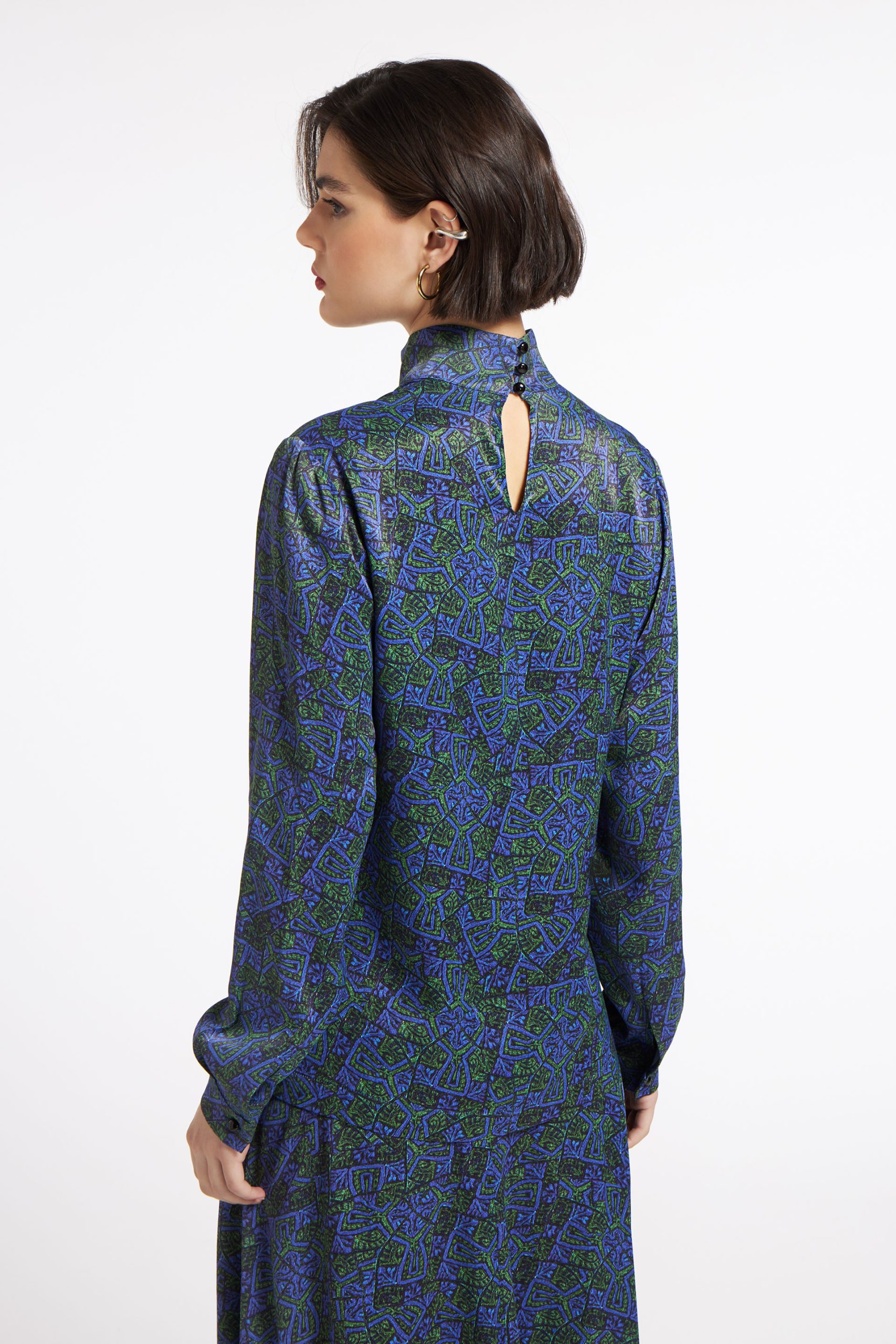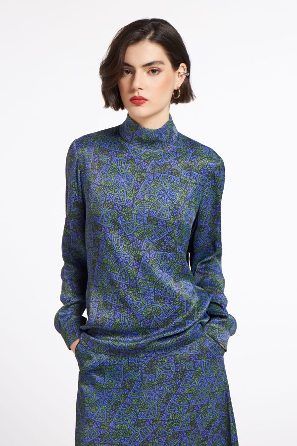 Cut from a crepe fabric, it has a slightly loose fit with a slouchy turtleneck and a button-fastening keyhole at neck.