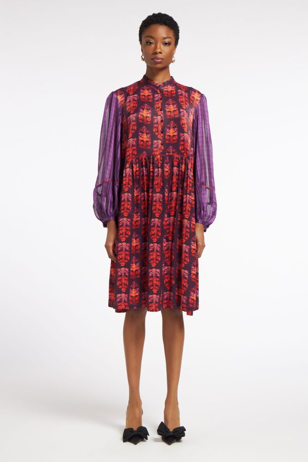 The button-up front and airy balloon sleeves in sheer fabric bring a touch of modern sophistication, while its elegant silhouette makes it a timeless choice.