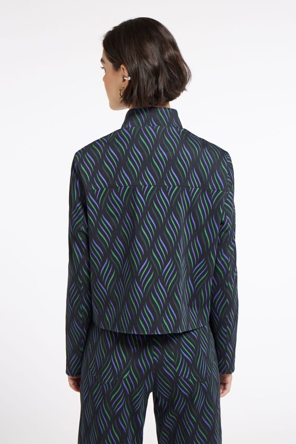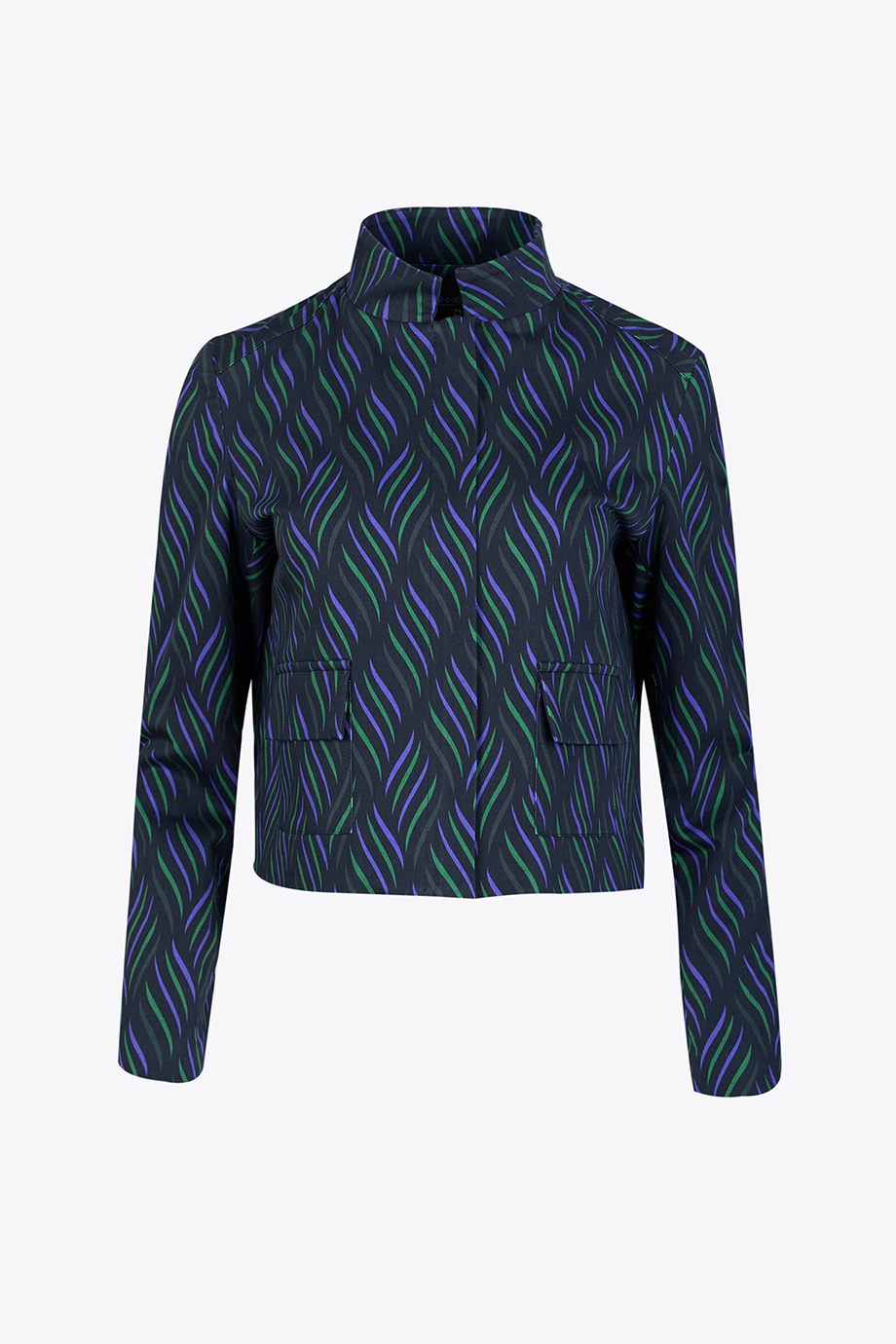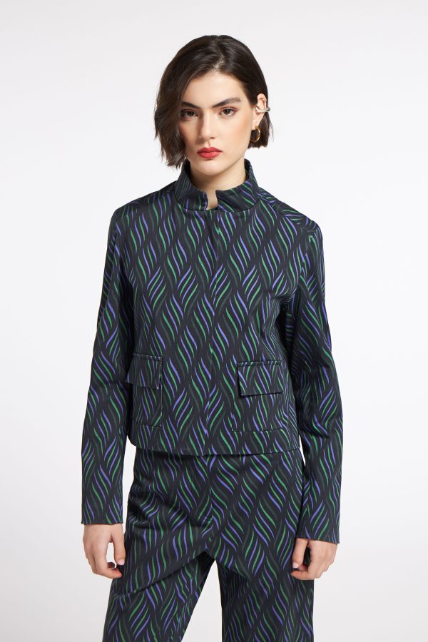 It features a hidden front zipper, a modern stand collar and two big pockets for both functionality and style.