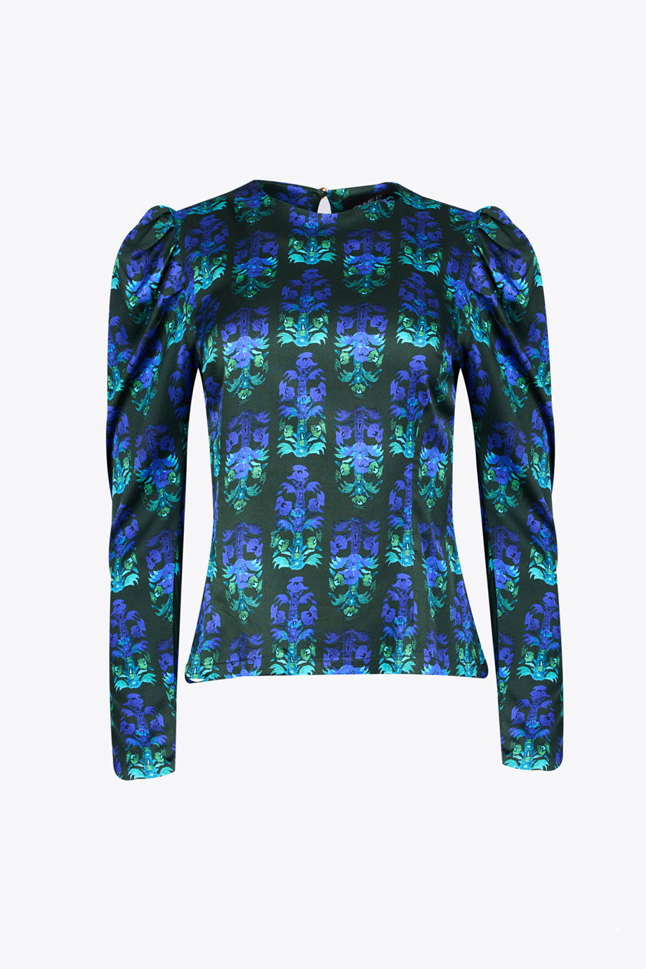 Make a bold fashion statement with this blouse. Painted in a serene palette of blue and green,