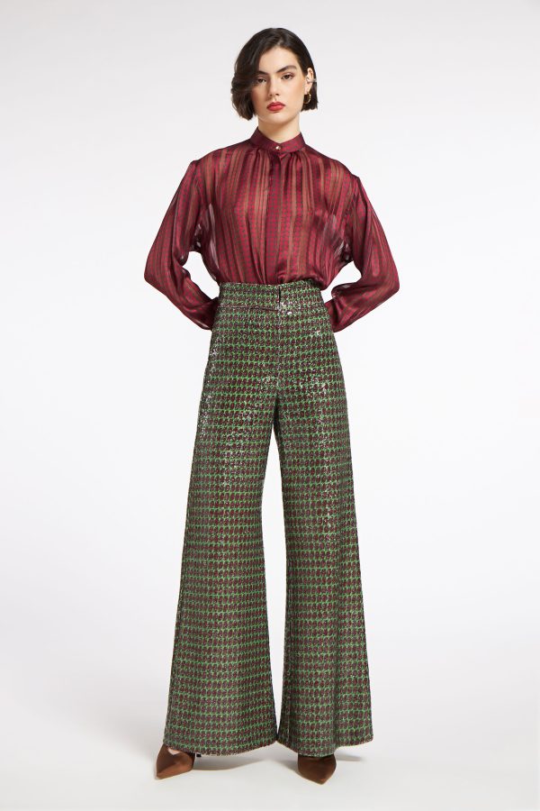 Its long cuffs along with the playful shimmering fabric offer an effortless unique style.