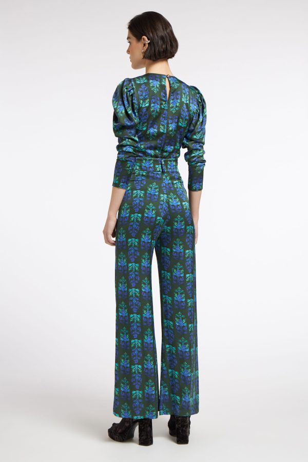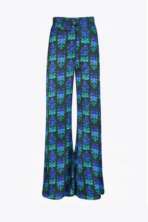 Zuma pants boast a high-waisted design that flatters the figure, while the flowing, wide-leg silhouette creates an effortlessly chic look. The bold green olive color, combined with the large-scale purple and black floral pattern, ensures you’ll stand out in any setting.